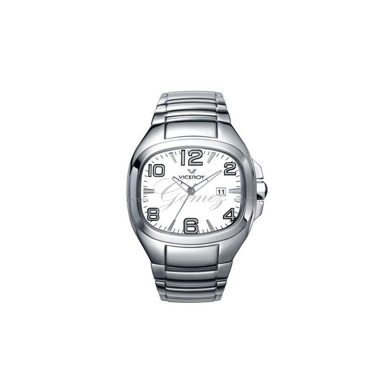 Reloj viceroy coleccion Genesis con movimiento de cuarzo analógico, calendario. Caja de acero cuadrada-ovalada, cristal mineral, esfera de color blanca. Pulsera de acero. W.R. 30m