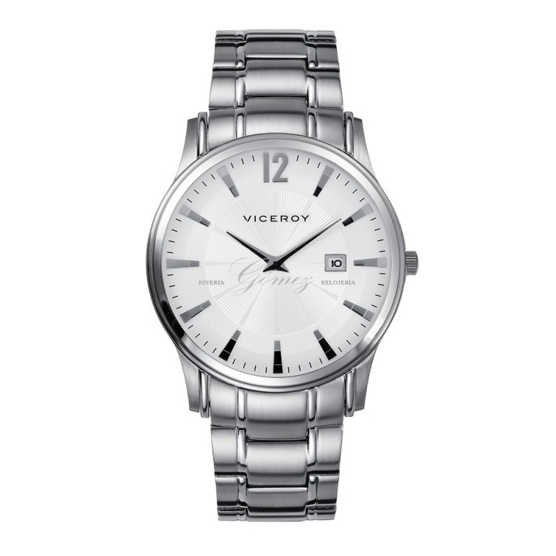 Reloj de caballero Viceroy con movimiento de cuarzo analógico, con calendario. Caja de acero redonda, esfera de color plata, cristal mineral. Pulsera de acero. W.R. 30m