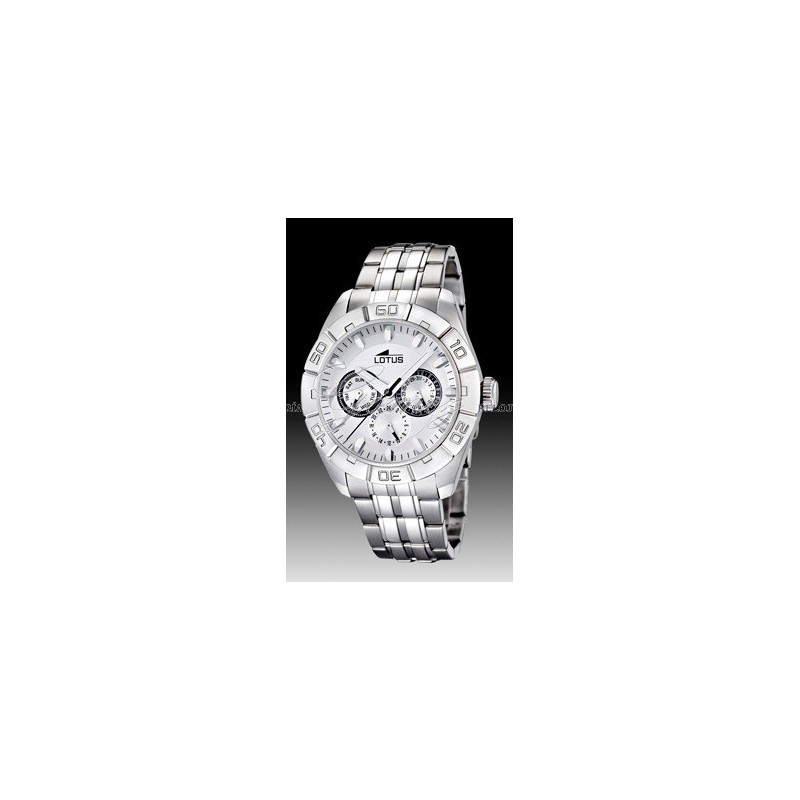 Reloj de caballero Lotus con movimiento de cuarzo analógico, multifunción. Caja de acero redonda, esfera de color plata. Pulsera de acero. W.R. 50m