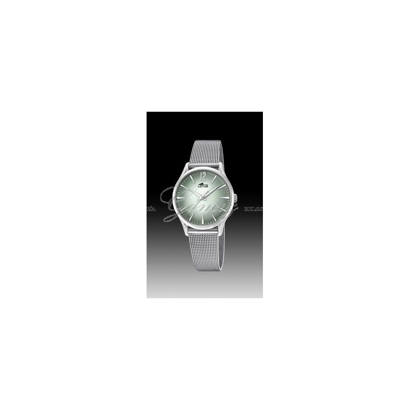 Reloj de Lotus de señora con movimiento de cuarzo analógico. Caja de acero redonda. Esfera de color gris. Pulsera de acero malla milanesa. W.R. 50m