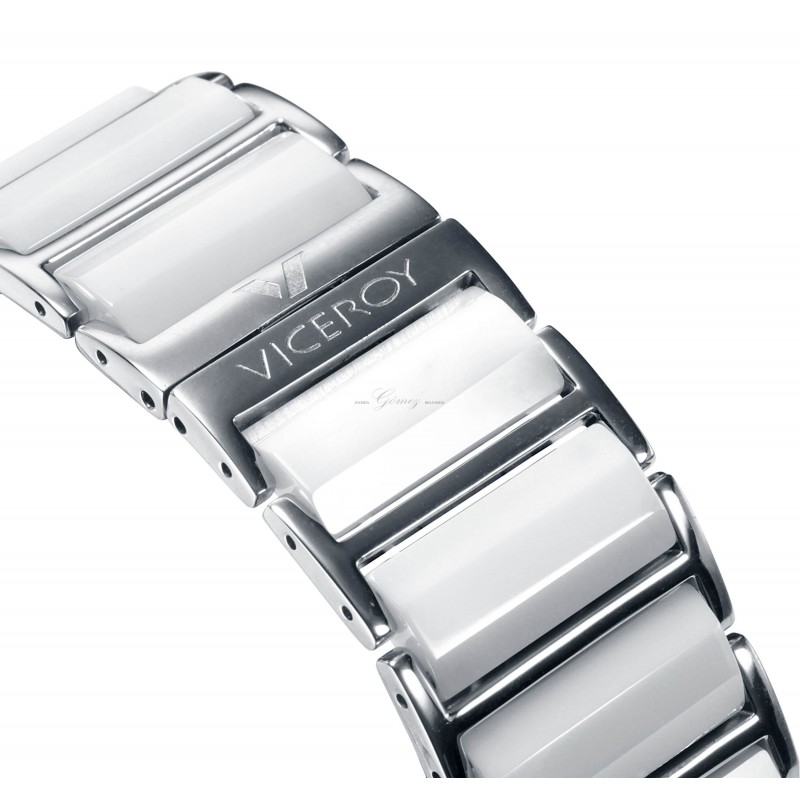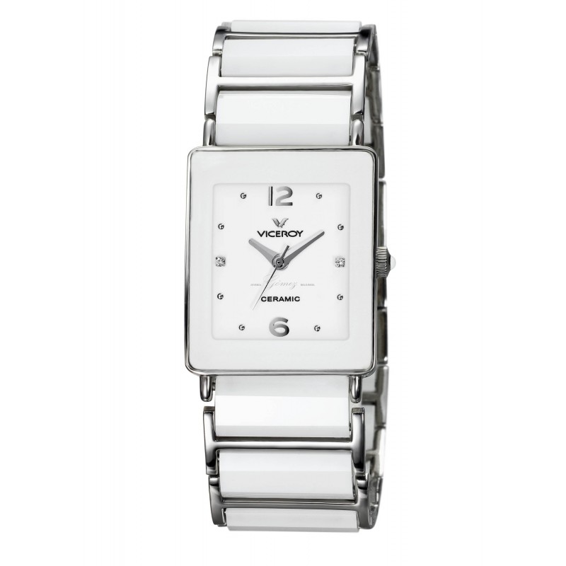 Reloj de señora Viceroy con movimiento de cuarzo analógico. Caja de acero cuadrada, esfera blanca, cristal mineral. Pulsera de eslabones de acero y cerámica blanca. W.R. 30m
