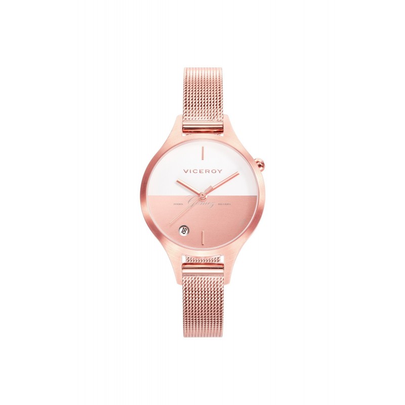 Reloj de señora Viceroy con movimiento de cuarzo analógico, calendario. Caja de acero redonda con tramiento PVD rosa, esfera blanca y cobre, cristal mineral. Pulsera de acero con tratamiento PVD rosa tipo esterilla. W.R. 50m
