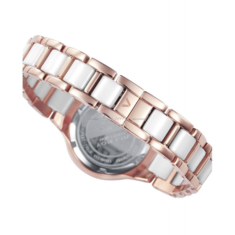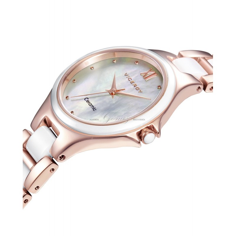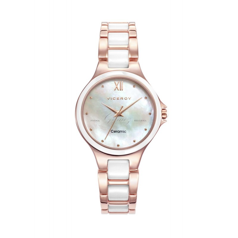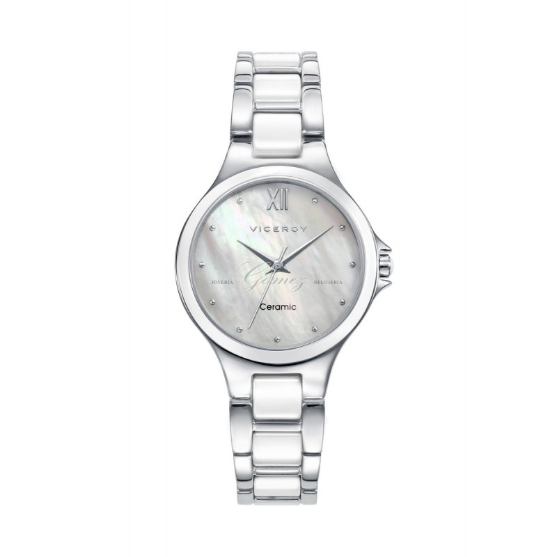 Reloj de señora Viceroy colección ceramic con movimiento de cuarzo analógico. Caja de acero redonda, esfera madre perla, cristal mineral. Pulsera de cerámica de color blanco, cierre desplegable. W.R. 50m