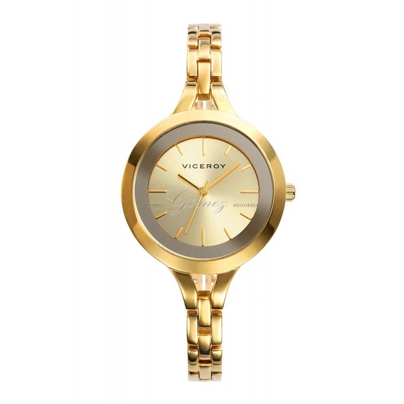 Reloj de señora Viceroy con movimiento de cuarzo analógico. Caja de acero redonda con tramiento PVD dorado, esfera dorada, cristal mineral. Pulsera de acero con tratamiento PVD dorado. W.R. 30m
