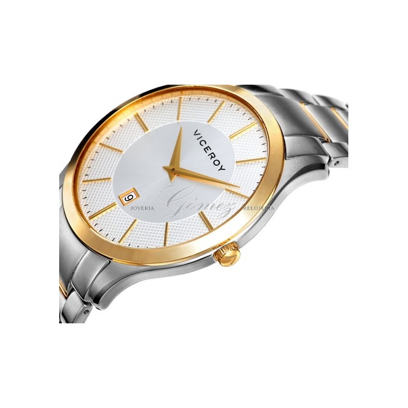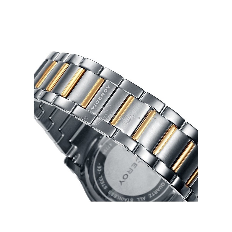 Reloj de señora Viceroy con movimiento de cuarzo analógico, calendario Caja de acero redonda, bisel chapado, esfera de color plata. Pulsera de acero bicolor. W.R. 30m