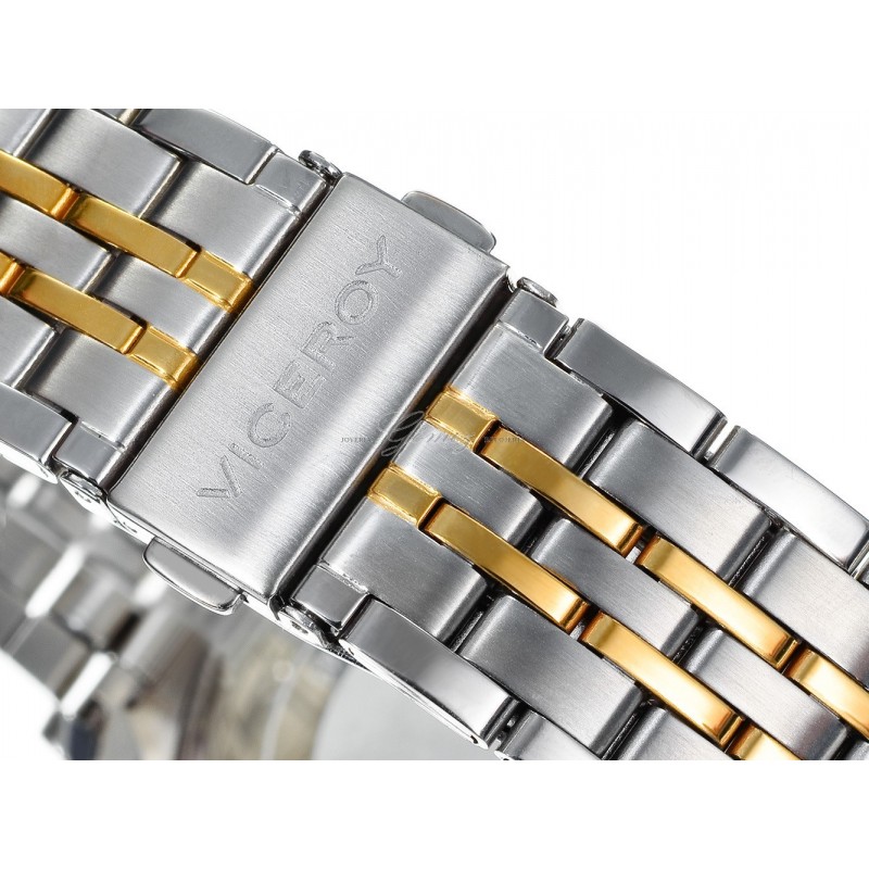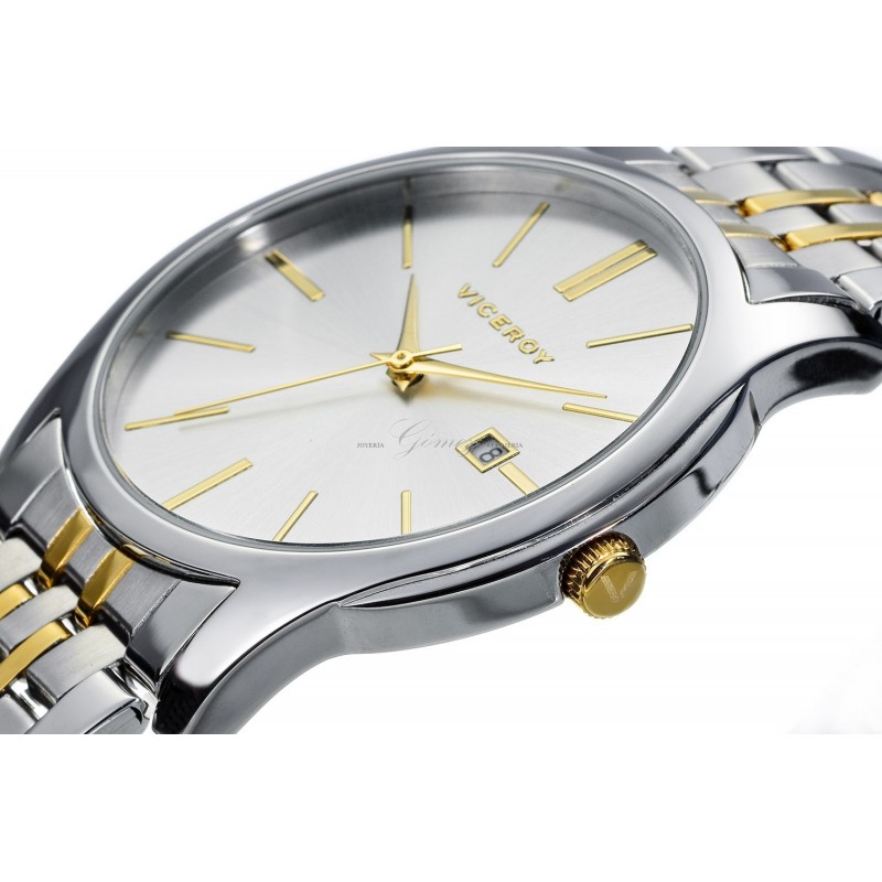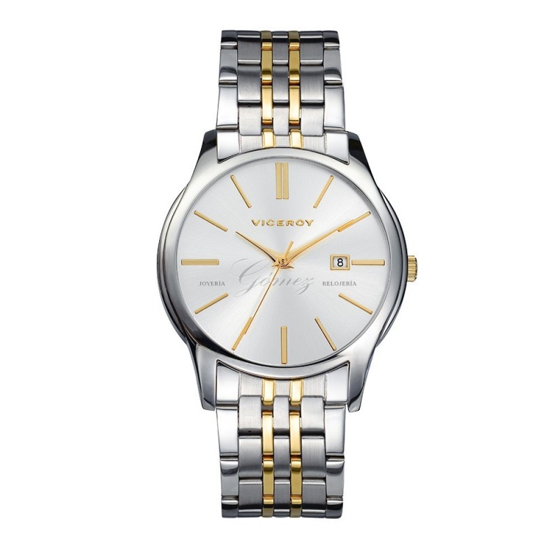 Reloj de caballero Viceroy con movimiento de cuarzo analógico, calendario. Caja de acero redonda, esfera de color plata. Armys de acero bicolor con tratamiento IP dorado. W.R. 30m