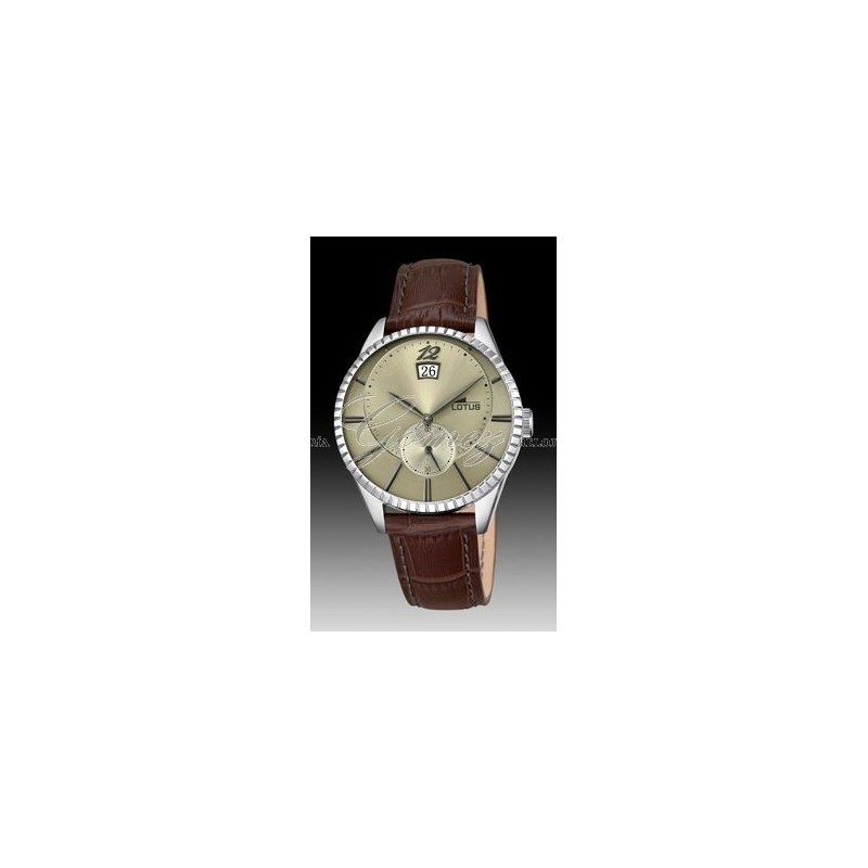 Reloj de acero Lotus de caballero con movimiento de cuarzo analógico, multifunción. Cristal mineral, esfera de color beige. Caja de acero redonda y pulsera de piel marrón. W.R. 50m