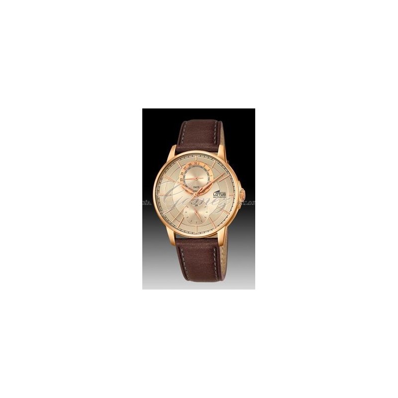 Reloj de caballero Lotus con movimiento de cuarzo analógico, multifunción. Caja de acero redonda con tratamiento IP dorado. Esfera de color crema y pulsera de piel de color marron. W.R. 50m