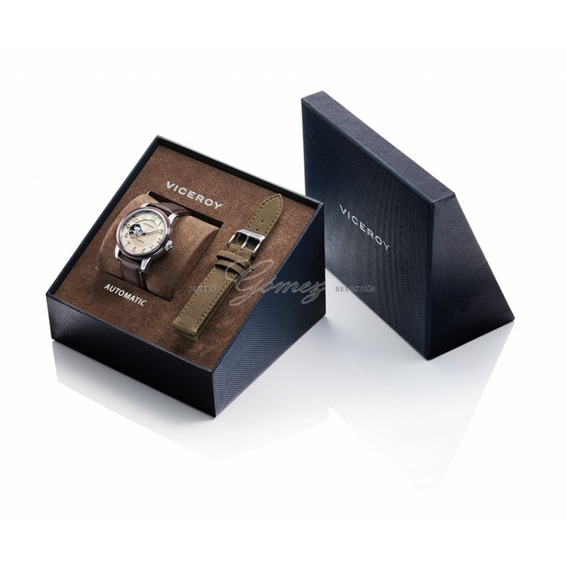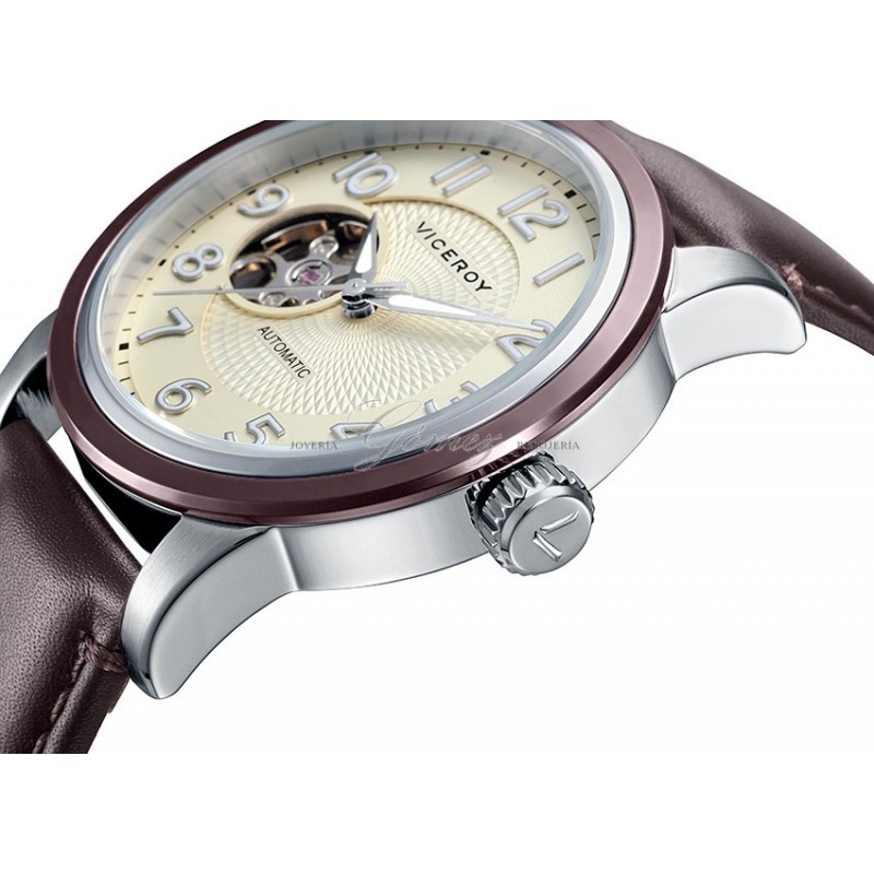 Reloj de caballero Viceroy automático. Caja de acero redonda, esfera de color crema, bisel con tratamiento IP marrón, cristal mineral. Pulsera de piel de color marron oscuro. W.R. 50m