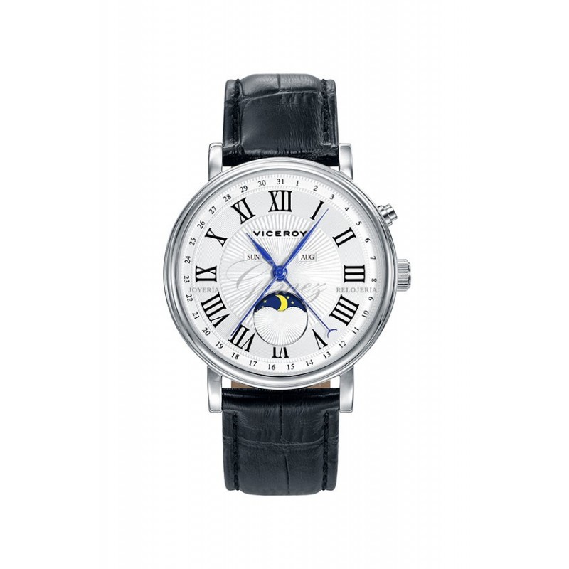 Reloj de caballero Viceroy con movimiento de cuarzo analógico, calendario lunar. Caja de acero redonda, esfera de color plata, cristal mineral. Pulsera de piel de color negro. W.R. 50m
