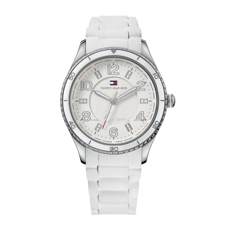 Reloj de acero de señora Tommy Hilfiger con movimiento de cuarzo analógico. Cristal mineral, esfera de color blanco. Caja de acero redonda, bisel de color blanco y correa de silicona blanca. W.R. 30m