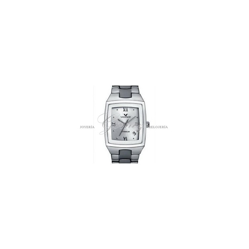 Reloj de señora Viceroy con movimiento de cuarzo analógico, con calendario. Caja de titanio cuadrado, esfera de color plata, cristal mineral. Pulsera de titanio. W.R. 30m