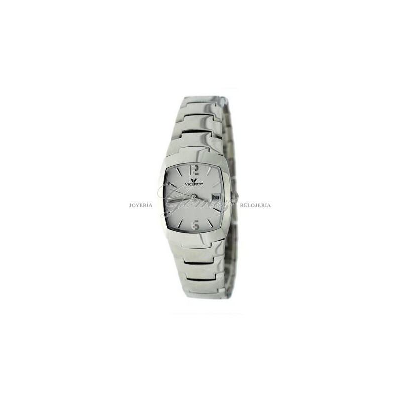 Reloj de señora Viceroy con movimiento de cuarzo analógico, calendario. Caja de acero cuadrada, esfera blanca, cristal mineral. Pulsera de acero. W.R. 30m