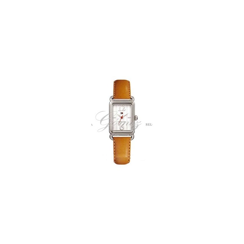 Reloj de acero de señora Tommy Hilfiger con movimiento de cuarzo analógico. Cristal mineral, esfera de color blanco con dibujo. Caja de acero rectangular y pulsera de piel de color marrón. W.R. 30m