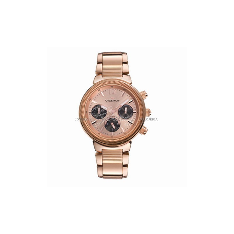 Reloj de señora Viceroy con movimiento de cuarzo analógico, multifunción. Caja de acero redonda con tramiento IP rosa, esfera con tratamiento IP rosa y negro, números y agujas con tratamiento IP rosa, cristal mineral. Pulsera de acero con tratamiento IP rosa. W.R. 30m