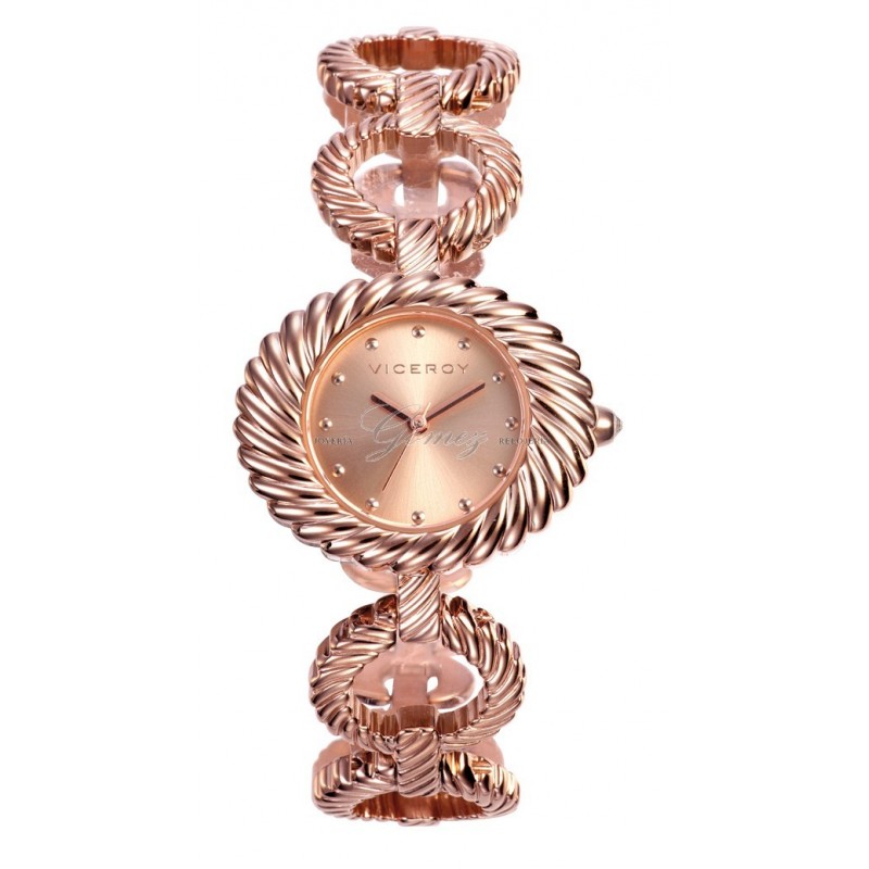 Reloj de señora Viceroy con movimiento de cuarzo analógico. Caja de acero redonda con tramiento IP rosa, esfera, números y agujas con tratamiento IP rosa, cristal mineral. Pulsera de acero con tratamiento IP rosa. W.R. 30m