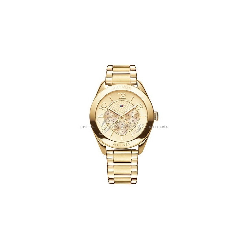 Reloj de acero de señora Tommy Hilfiger con movimiento de cuarzo analógico, multifunción. Cristal mineral, esfera de de color dorado. Caja de acero inoxidable con tratamiento pvd dorado redonda y pulsera de acero inoxidable con tratamiento pvd dorado. W.R. 30m