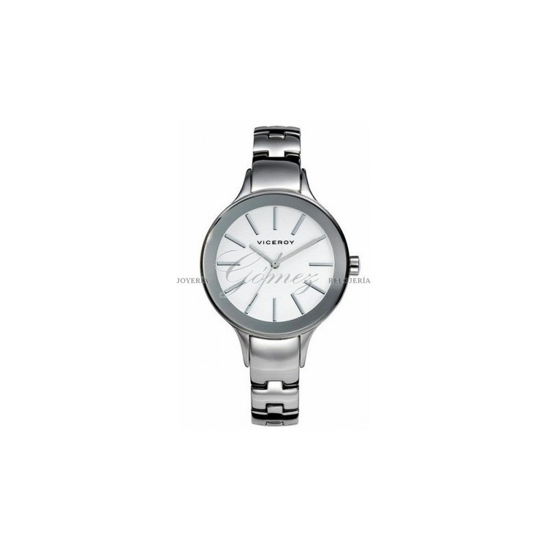 Reloj de señora Viceroy con movimiento de cuarzo analógico. Caja de acero redonda, esfera blanca, cristal mineral, bisel de color plata. Pulsera de eslabones de acero. W.R. 30m
