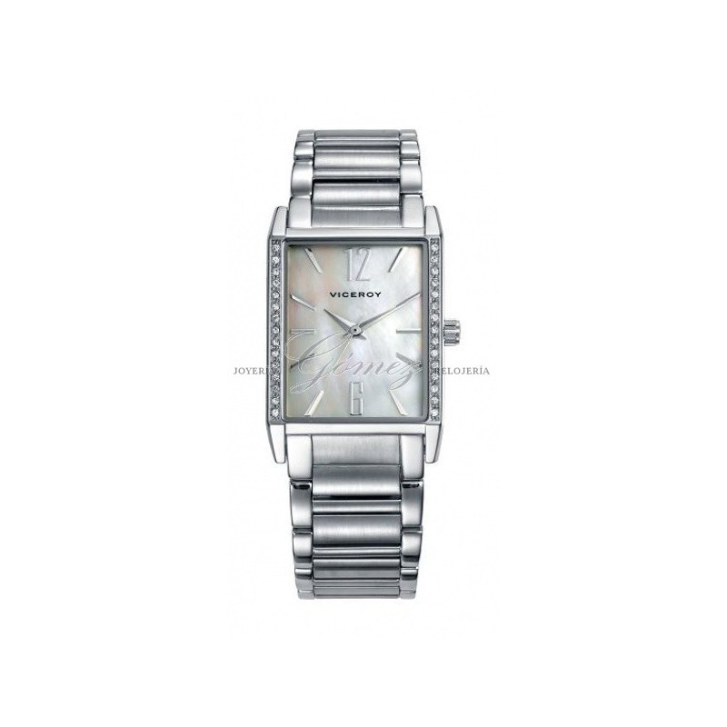 Reloj de señora Viceroy con movimiento de cuarzo analógico. Caja de acero cuadrada con piedras en los laterales, esfera nacarada, cristal mineral. Pulsera de eslabones de acero. W.R. 50m