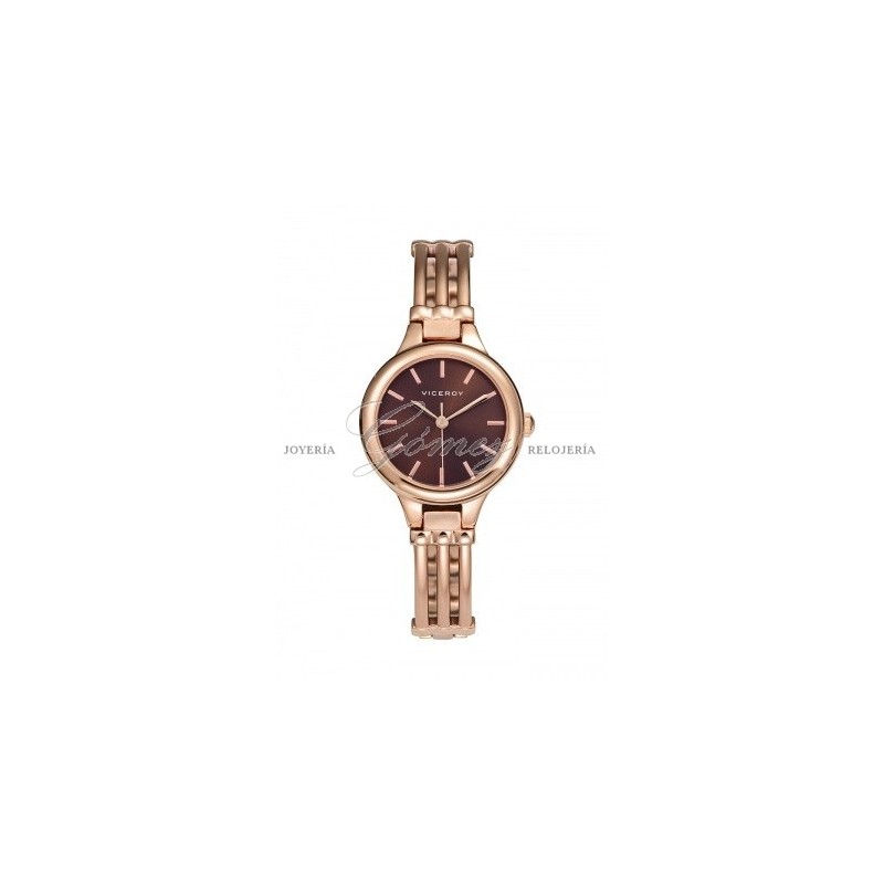 Reloj de señora Viceroy con movimiento de cuarzo analógico. Caja de acero redonda con tramiento IP rosa, esfera marrón oscuro, números y agujas con tratamiento IP rosa, cristal mineral. Pulsera de acero con tratamiento IP rosa. W.R. 30m