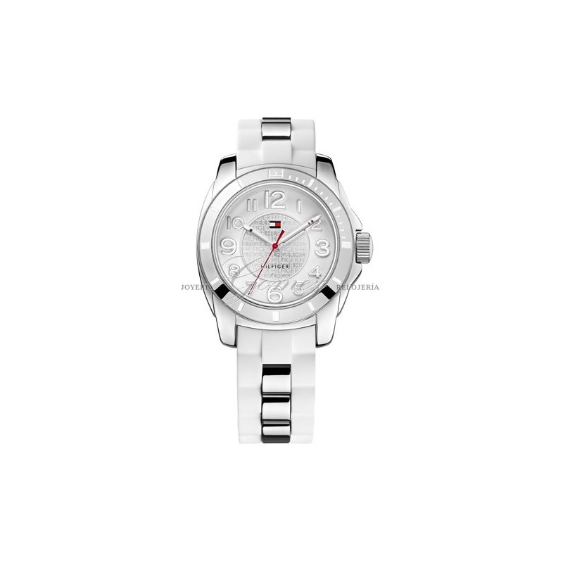 Reloj de acero de señora Tommy Hilfiger con movimiento de cuarzo analógico. Cristal mineral, esfera de color blanco. Caja de acero redonda y correa de silicona blanca. W.R. 30m