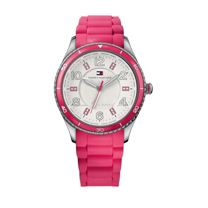 Reloj de acero de señora Tommy Hilfiger con movimiento de cuarzo analógico. Cristal mineral, esfera de color blanco. Caja de acero redonda, bisel de color fucsia y correa de silicona fucsia. W.R. 30m