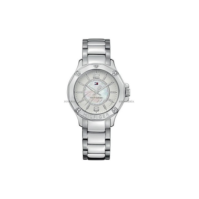 Reloj de acero de señora Tommy Hilfiger con movimiento de cuarzo analógico. Cristal mineral, esfera nacarada con circulo de circonitas. Caja de acero redonda, bisel con circonitas y pulsera de acero. W.R. 30m