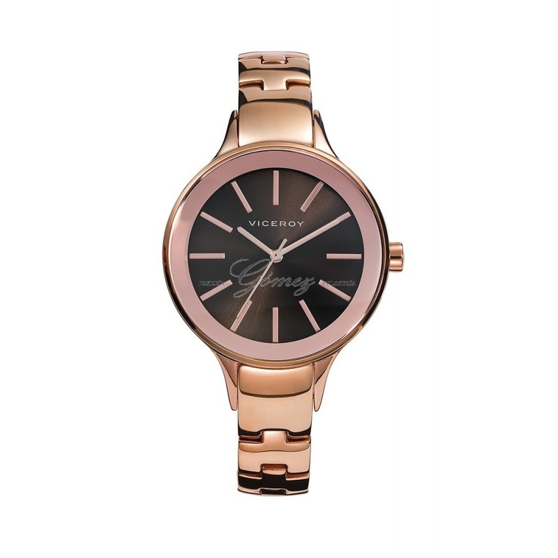 Reloj de señora Viceroy con movimiento de cuarzo analógico. Caja de acero redonda con tramiento IP rosa, esfera marrón oscuro, números y agujas con tratamiento IP rosa, cristal mineral. Pulsera de acero con tratamiento IP rosa. W.R. 30m