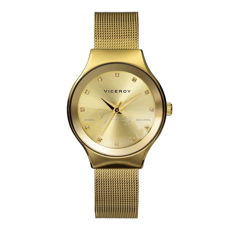 Reloj de señora Viceroy con movimiento de cuarzo analógico. Caja de acero redonda con tramiento PVD dorado, esfera dorada, cristal mineral. Pulsera de acero con tratamiento PVD dorado tipo esterilla. W.R. 30m