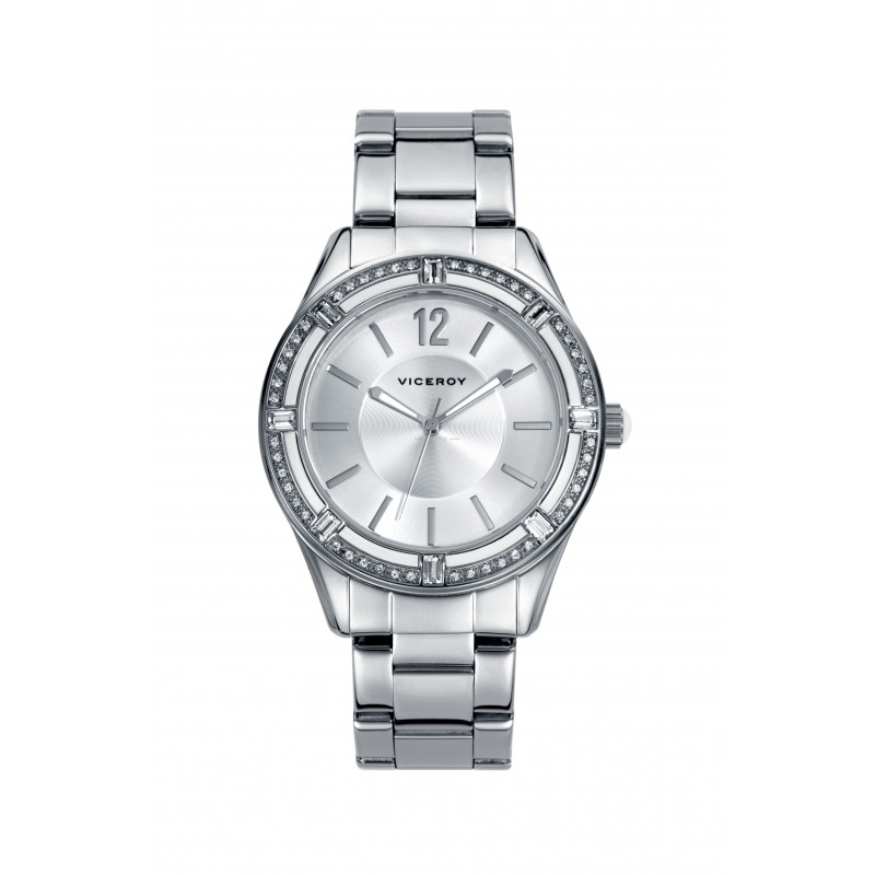 Reloj de señora Viceroy con movimiento de cuarzo analógico. Caja de acero redonda, esfera de color plata, cristal mineral, bisel con piedras. Pulsera de acero. W.R. 30m