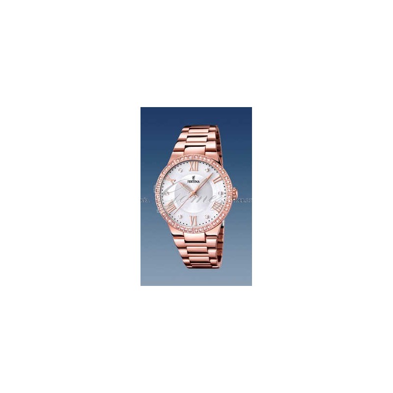 Reloj de señora Festina con movimiento de cuarzo analógico. Caja de acero chapado rosa rendonda, esfera de color blanco, bisel con piedras. Pulsera de acero chapado rosa. W.R. 50m