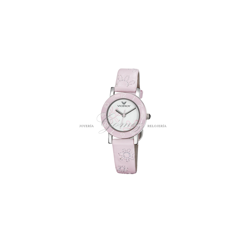 Reloj de seora Viceroy con movimiento de cuarzo analgico. Caja de acero redonda, esfera blanca con flores rosas, bisel rosa con numeros de color blanco, cristal mineral. Pulsera de piel de color rosa con flores.