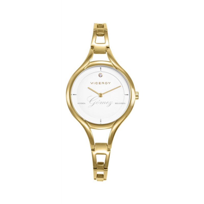 Reloj Viceroy para mujer de la colección Air fabricado en acero inoxidable plateado y negro. Estamos ante un atractivo reloj de diseño femenino compuesto por caja plateada de 30mm de diámetro con esfera negra que cuenta con 2 agujas plateadas movidas por mecanismo de cuarzo analógico protegido por cristal mineral. Su brazalete lo forman elegantes eslabones dorados con cierre de joyería. resistente al agua hasta 5 ATM.