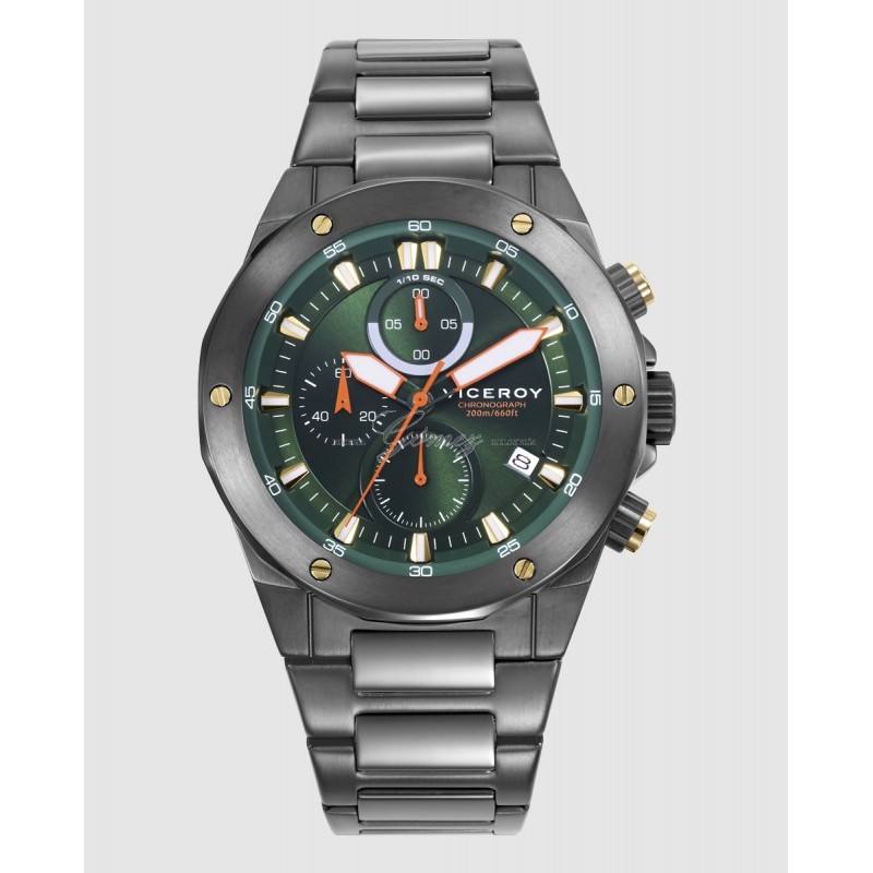 Reloj cronógrafo de hombre combina caja de acero Ip gris con tornillos dorados 20Atm y brazalete a juego. Su esfera verde con índices, junto a las agujas horarias y contadoras en naranja y verde y cristal mineral resistente, aporta carácter y sofisticación funcional al conjunto.