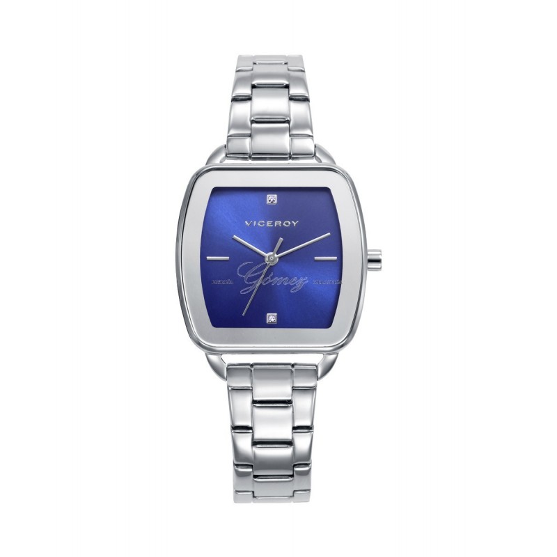 Este reloj presenta caja y brazalete de acero que aportan solidez y confort. La esfera azul, adornada con índices y sutiles circonitas, se completa con agujas horarias en color plata y cristal mineral resistente, convirtiéndolo en un accesorio perfecto para el día a día y ocasiones especiales, ofreciendo un equilibrio entre funcionalidad y detalle elegante.