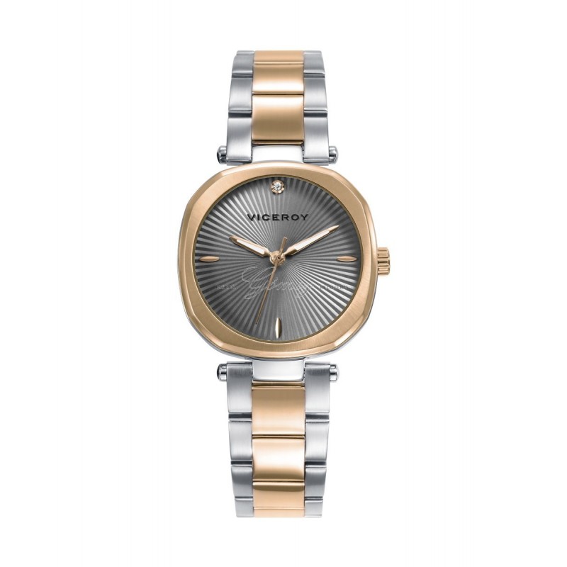 Reloj Viceroy Mujer Acero Bicolor Rose Analógico. Caja de acero bicolor rose de 31mm de diámetro. Bisel rose. Brazalete de acero bicolor rose. Cierre desplegable. Esfera gris. Cristal mineral. Movimiento quartz. W.R. 30m.