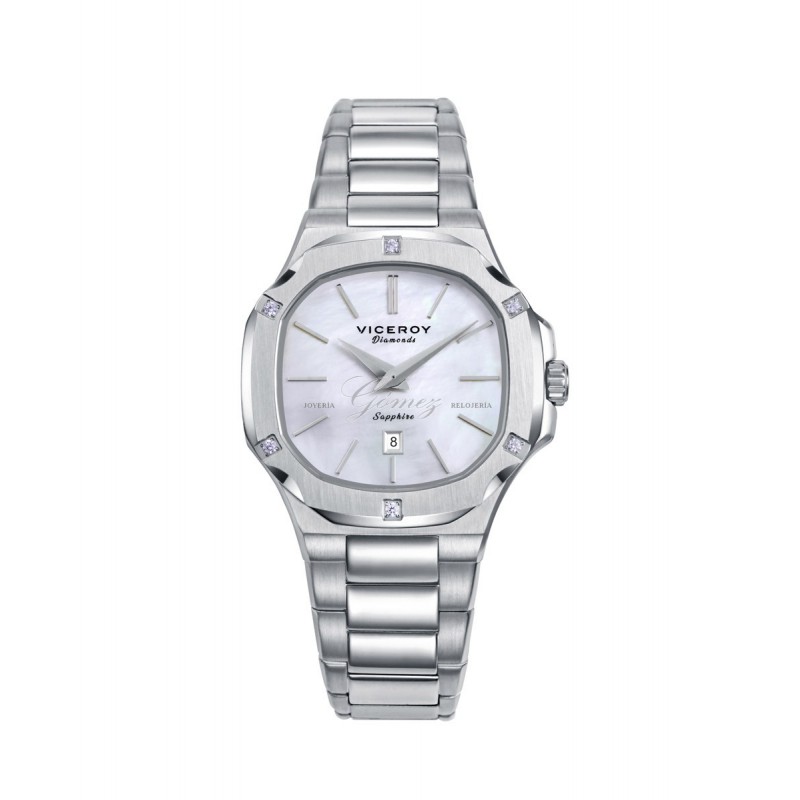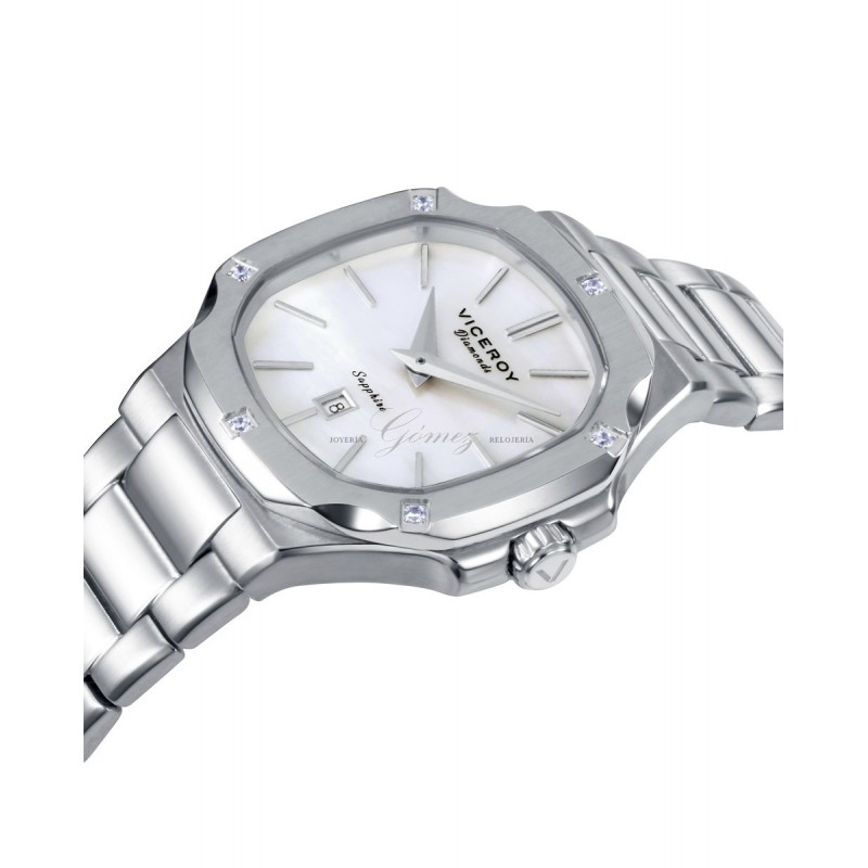 Reloj Viceroy para mujer de la colección Laura Escanes fabricado en acero inoxidable plateado. Estamos ante un elegante reloj compuesto por caja de 32mm de diámetro con bisel plateado que cuenta con 6 diamantes creados en laboratorio. Su esfera es nacarada con indicadores en forma de barras plateadas al igual que sus agujas movidas por mecanismo de cuarzo analógico con función de calendario. Todo ello protegido por cristal de Zafiro. Su brazalete lo forman eslabones plateados con cierre desplegable mediante doble pulsador. Resistente al agua hasta 10 ATM
