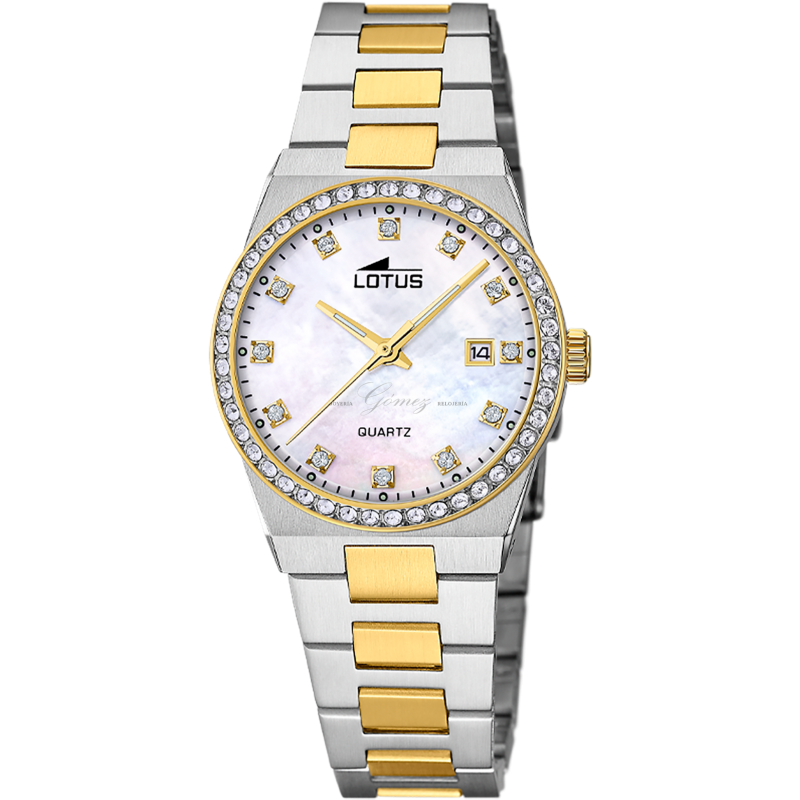 Reloj Lotus para mujer de la colección Freedom fabricado en acero inoxidable plateado y dorado. Este elegante reloj cuenta con caja de 31,5mm de diámetro con bisel compuesto por cristales brillantes. Su esfera es nacarada con indicadores compuestos por cristales incrustados y agujas doradas movidas por mecanismo de cuarzo analógico con función de calendario. Todo ello protegido por cristal mineral. Su brazalete lo forman eslabones plateados y dorados con cierre desplegable mediante doble pulsador. Resistente al agua hasta 10 ATM.
