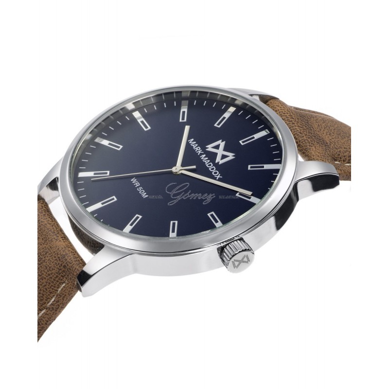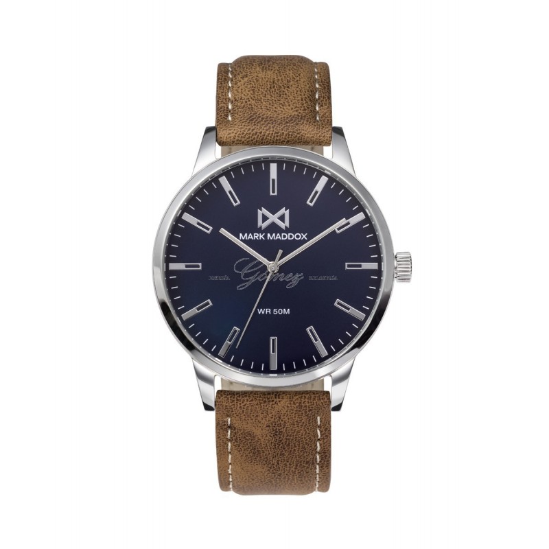 Reloj de caballero Mark Maddox con movimiento de cuarzo analógico. Caja de acero redonda, esfera de color azul oscuro. Pulsera de piel de color marron. W.R. 50m