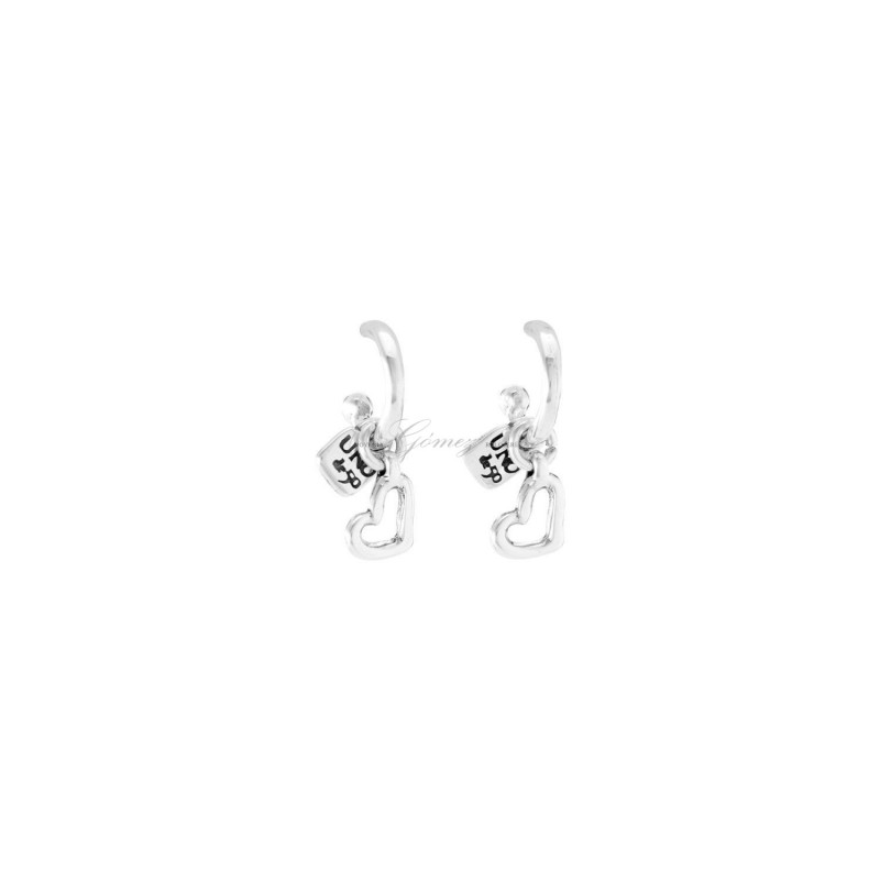 Originales pendientes de aro en metal bañado en plata adornados con un charm en forma de corazón. De inspiración romántica y diseño versátil, este modelo está especialmente dirigido a las personalidades más dulces. Hecho a mano en España, de manera 100% artesanal con estilo único e inconfundible de UNOde50®.