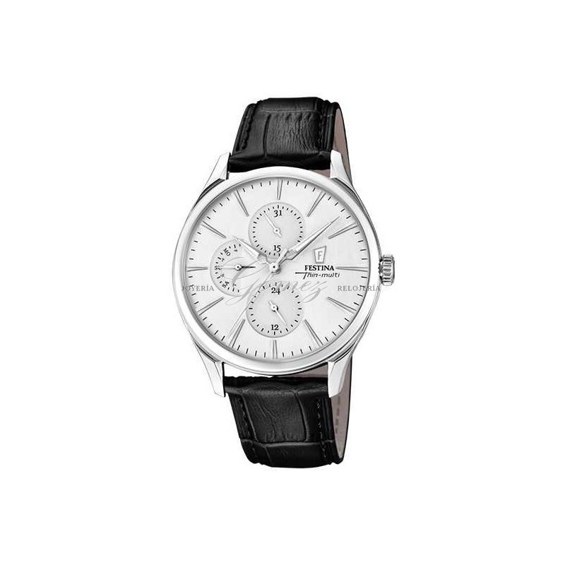 Reloj de caballero Festina con movimiento de cuarzo analógico, multifuncion. Caja de acero redonda, cristal mineral, esfera de color plata. Pulsera de piel de color negro. W.R. 30m