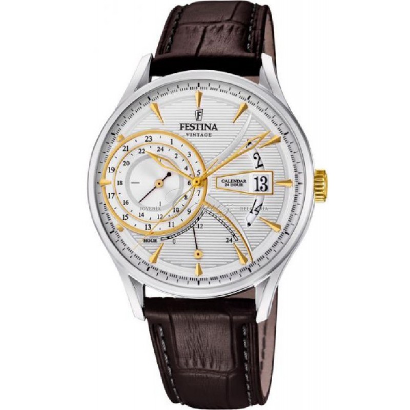 Reloj de caballero Festina con movimiento de cuarzo analógico, multifunción. Caja de acero redonda, cristal mineral, esfera de color plata y dorado. Pulsera de piel de color marron. W.R. 30m