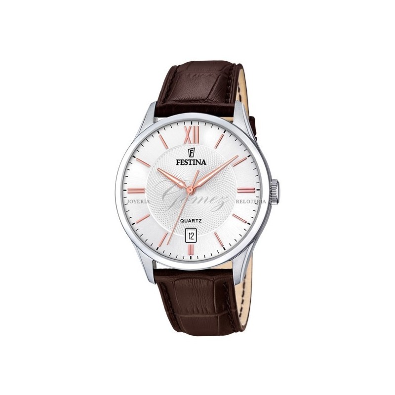 Reloj de caballero Festina con movimiento de cuarzo analógico con calendario. Caja de acero redonda, cristal mineral, esfera de color blanco/rosé. Pulsera de piel de color marrón. W.R. 50m
